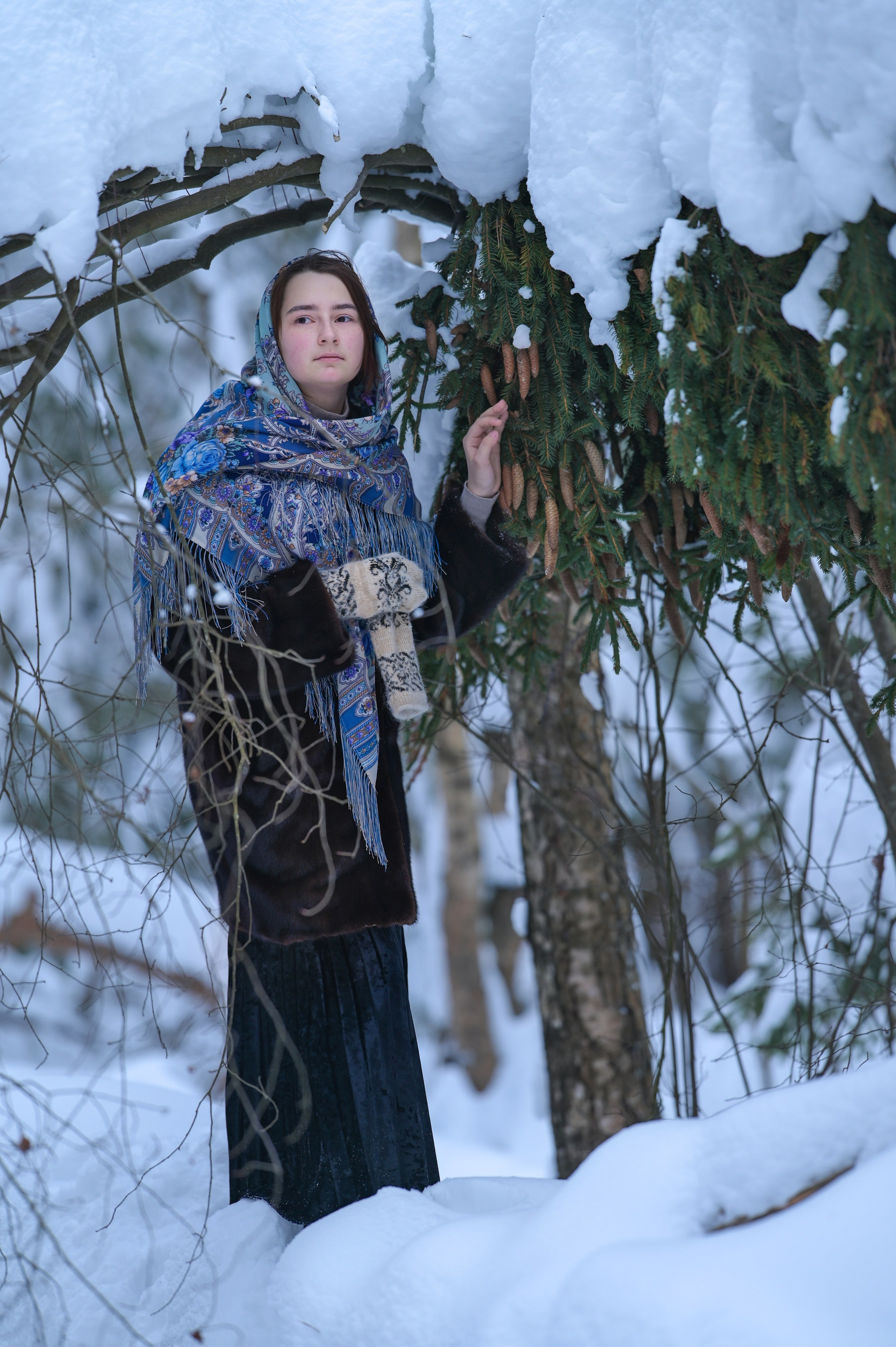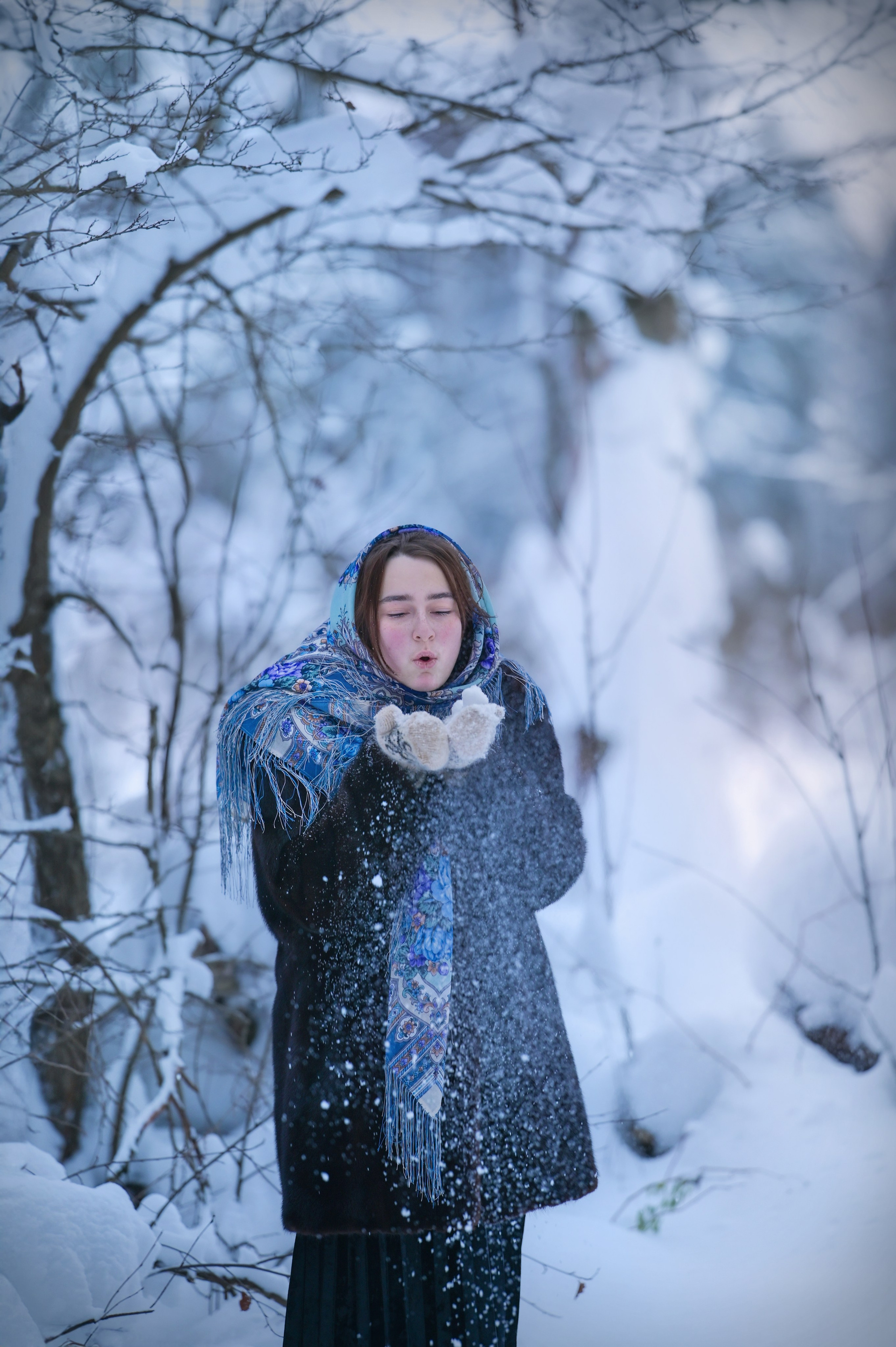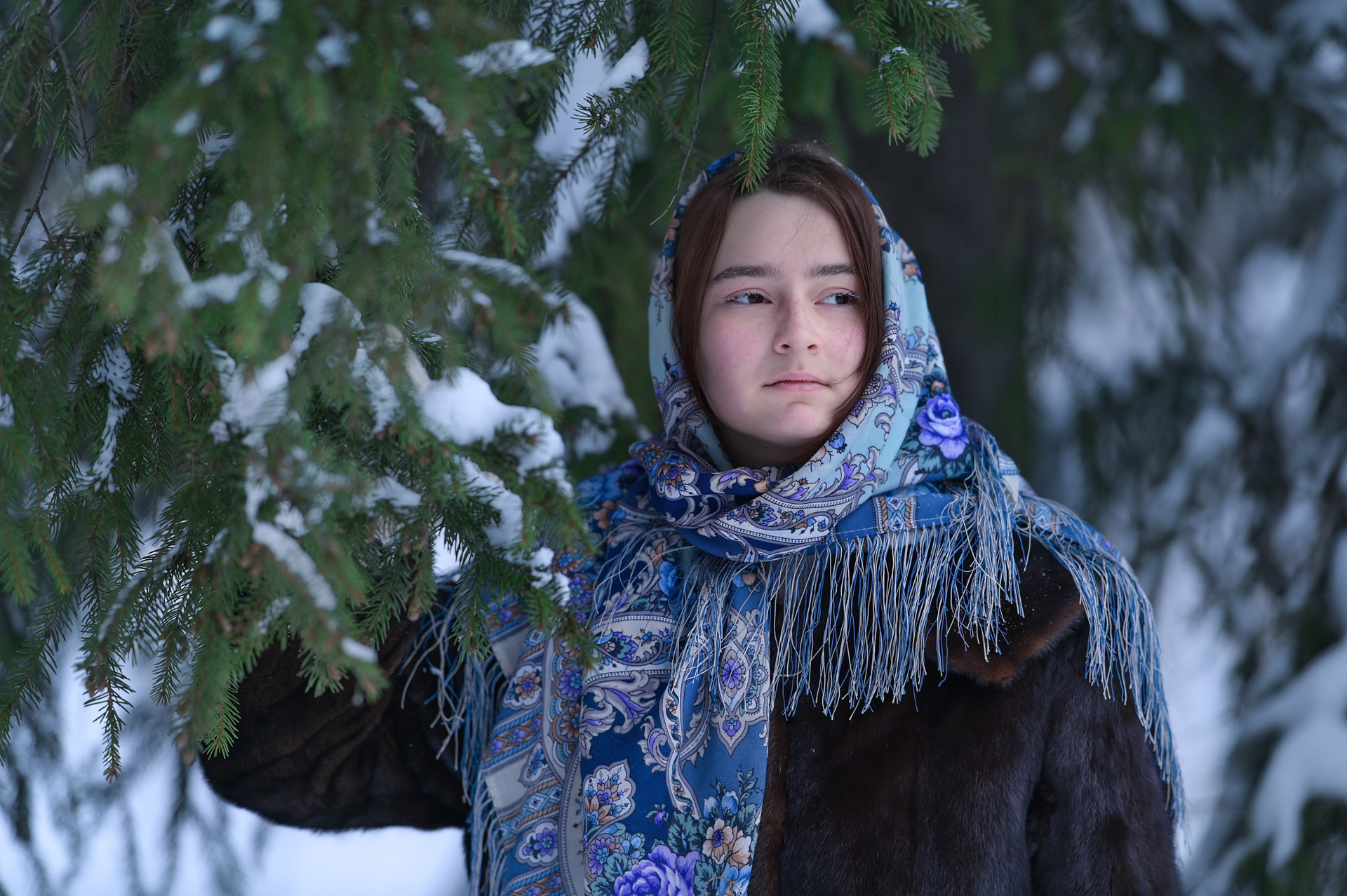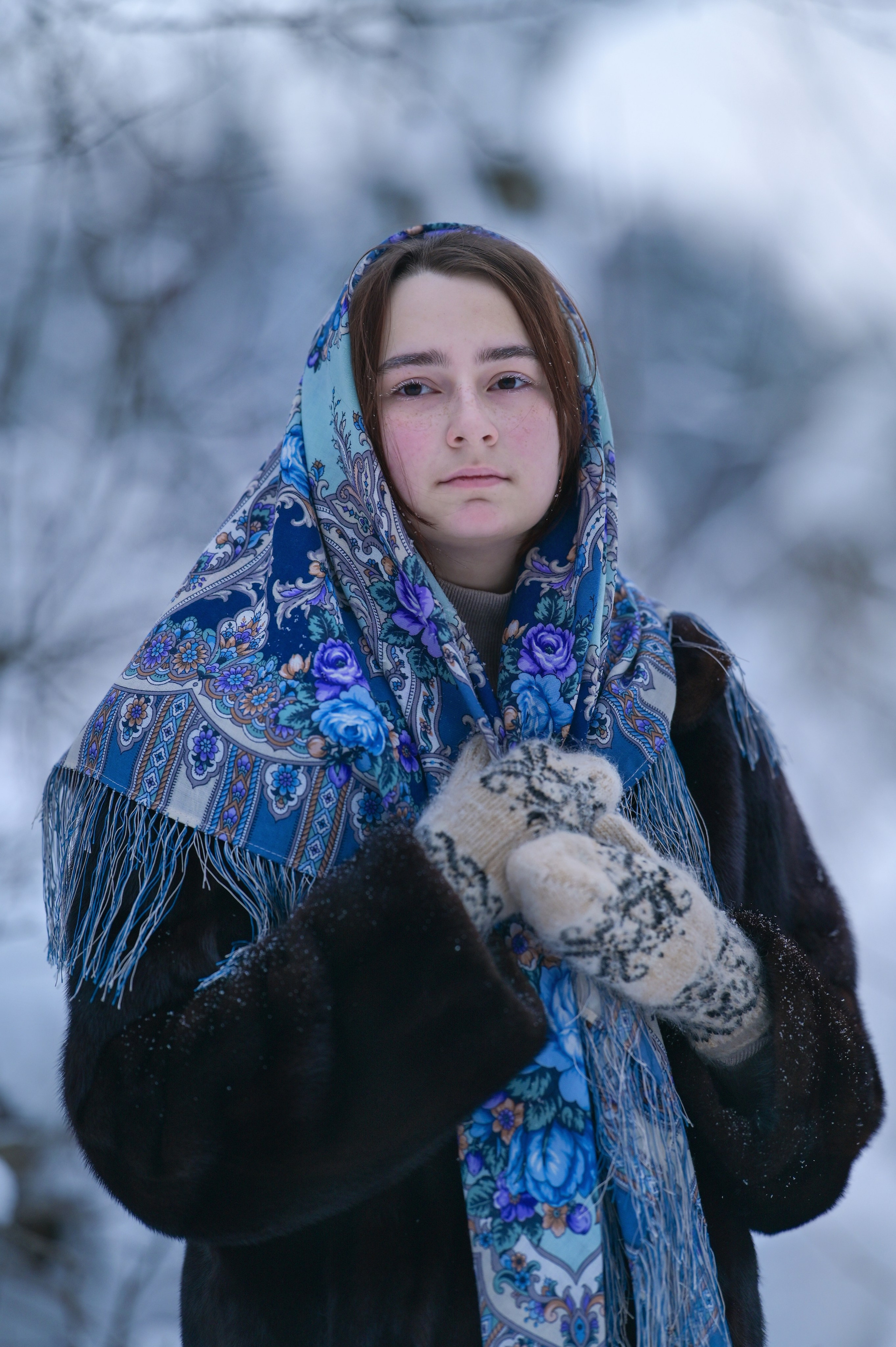 Художественный портрет голубоглазой брюнетки в белой косынке